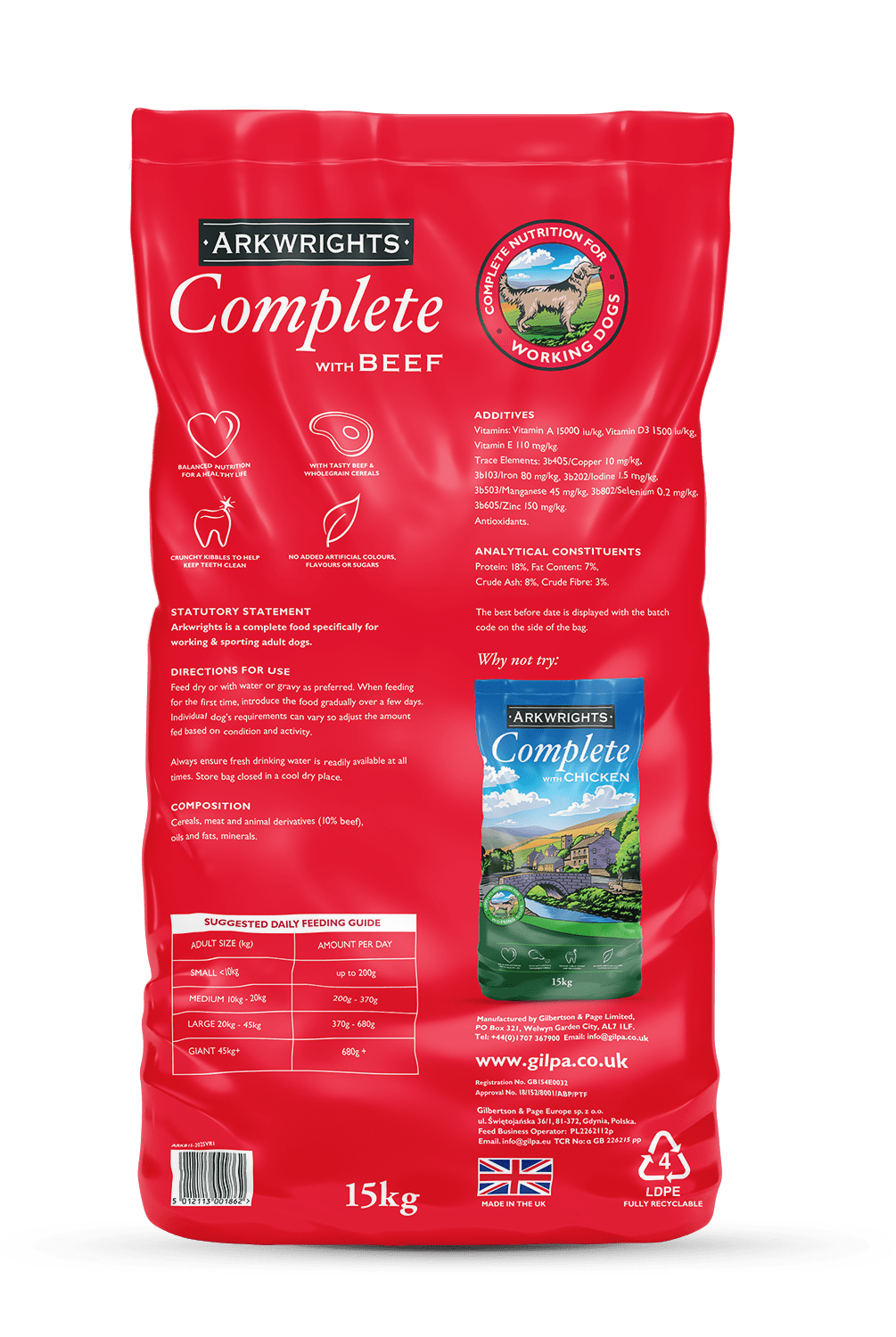 A simple working diet, with chicken or beef and whole grain cereals for palatability and slow energy release. Suitable for: Adult Dogs Composition Cereals, meat and animal derivatives (minimum 4% chicken/beef), oils and fats, mineralsidants. Nutritional Information Protein 18.0% Oils and Fats 7.3% Fibre 3% Ash 6.0%