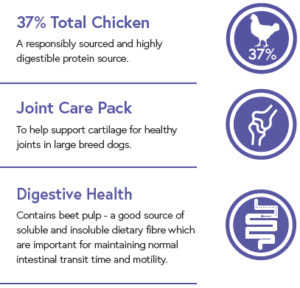 Our Super Premium Chicken & Rice Large Breed Adult benefits from a variety of high quality protein sources and is hypoallergenic – formulated without some of the common food allergens for dogs – beef, pork, wheat, wheat gluten, dairy and soya.
