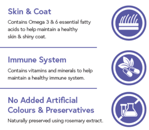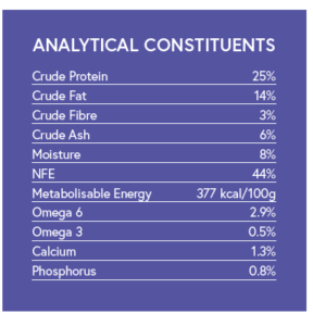 Composition: Chicken 37% (Including Dried Chicken 29%, Chicken Fat 7% & Chicken Gravy 1%), Rice (27%), Barley, Oats, Beet Pulp (2%), Brewer’s Yeast, Omega 3 Supplement, Minerals, Vitamins, Glucosamine (355 mg/kg), Methylsulfonylmethane (335 mg/kg), Chondroitin Sulphate (250 mg/kg)