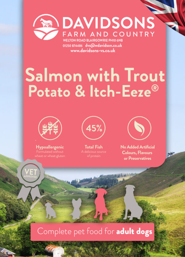 Super Premium Fish & Potato with Allergy-X® – Adult Dog Formulated with an intelligent blend of hydrolysed fish, fish meals and fish oil to help promote digestibility Hypoallergenic – Formulated without Formulated without Beef, Pork, Lamb, Chicken, Soya, Dairy, Eggs, Yeast, cereals, wheat & wheat gluten Digestive Health – Contains high levels of Fish and Potato for optimum palatability and small firm stools Skin & Coat – Contains Omega 3 & 6 essential fatty acids, Zinc and Biotin to help maintain a healthy skin & coat Immune System – Contains vitamins and minerals to help maintain a healthy immune system Allergy-X ® – a unique blend of herbs which may help alleviate “allergic signs such as itching, hair loss and mucky ears” Composition 44% Fish (Salmon 18%, Salmon Meal 8%, Blended Fish Meal 8%, Trout 7%, Salmon Oil 1.65%, Salmon Gravy 1.65%), 36% Potato (Dried Potato 18%, Dried Sweet Potato 18%), Pea Starch (7%), Sugar Beet Pulp, Lucerne, Sunflower Oil, Minerals, Vitamins, Allergy-X ® (0.3%) Nutritional Additives per KG Vitamins: Vitamin A 15,000 IU, Vitamin D3 2,250 IU, Biotin 150 mcg; Trace Elements: Ferrous Sulphate Monohydrate 167 mg (Iron 50 mg), Zinc Sulphate Monohydrate 139 mg (Zinc 50 mg), Manganous Sulphate Monohydrate 109 mg (Manganese 35 mg), Cupric Sulphate Pentahydrate 60 mg (Copper 15 mg), Calcium Iodate Anhydrous 1.64 mg (Iodine 1 mg), Sodium Selenite 0.67 mg (Selenium 0.3 mg)