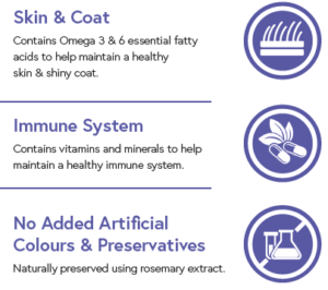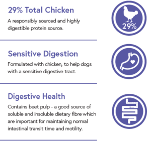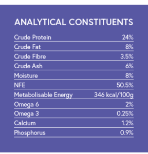 Composition: Chicken 29% (Including Dried Chicken 26% & Chicken Fat 3%), Rice (29%), Barley, Oats, Beet Pulp (2%), Brewer’s Yeast, Minerals, Vitamins, Yucca Extract (190 mg/kg)