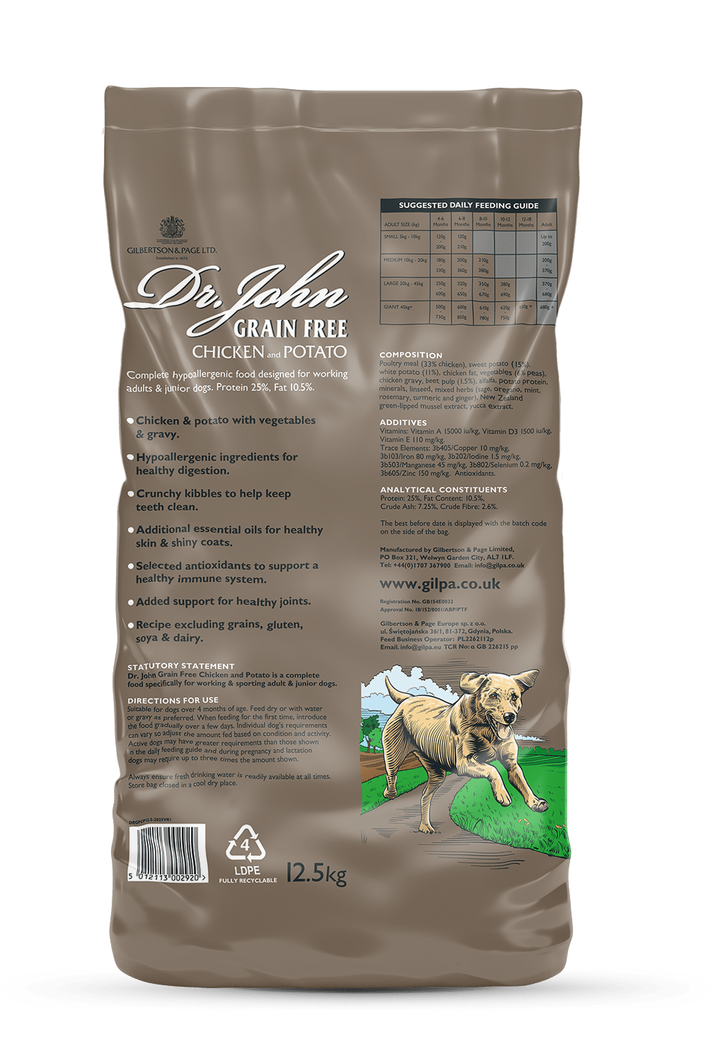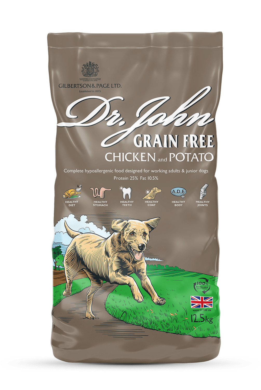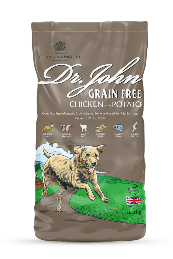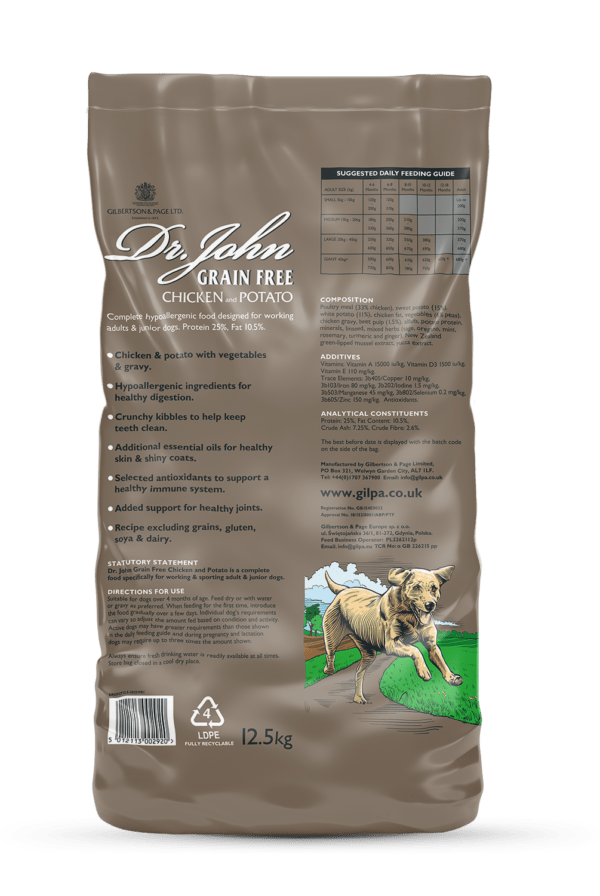 Dr. John Grain-Free Chicken and Potato is a nutritionally balanced hypoallergenic dog food that provides the perfect diet for junior, adolescent, and adult dogs with sensitive stomachs. A special recipe made without cereals, wheat, wheat gluten, dairy or soya but with high levels of tasty chicken (33%) with vegetables. With higher levels of nutrients, 25% protein and 10.5% fat and added New Zealand green-lipped mussel extract for healthy joints. Our crunchy bite-sized kibbles are made with high quality, natural ingredients and no added artificial colours, flavours or sugars as standard