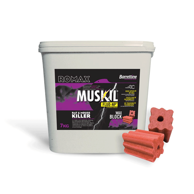 MUSKIL® BLOCK FLUO-NP® is a bi-component ready for use wax block bait of 25 g for house mice (Mus musculus) and brown rats (Rattus norvegicus) treatments containing the patented combination of two 2nd generation active ingredients, difenacoum and bromadiolone, and is effective against mice and rats after a single ingestion.